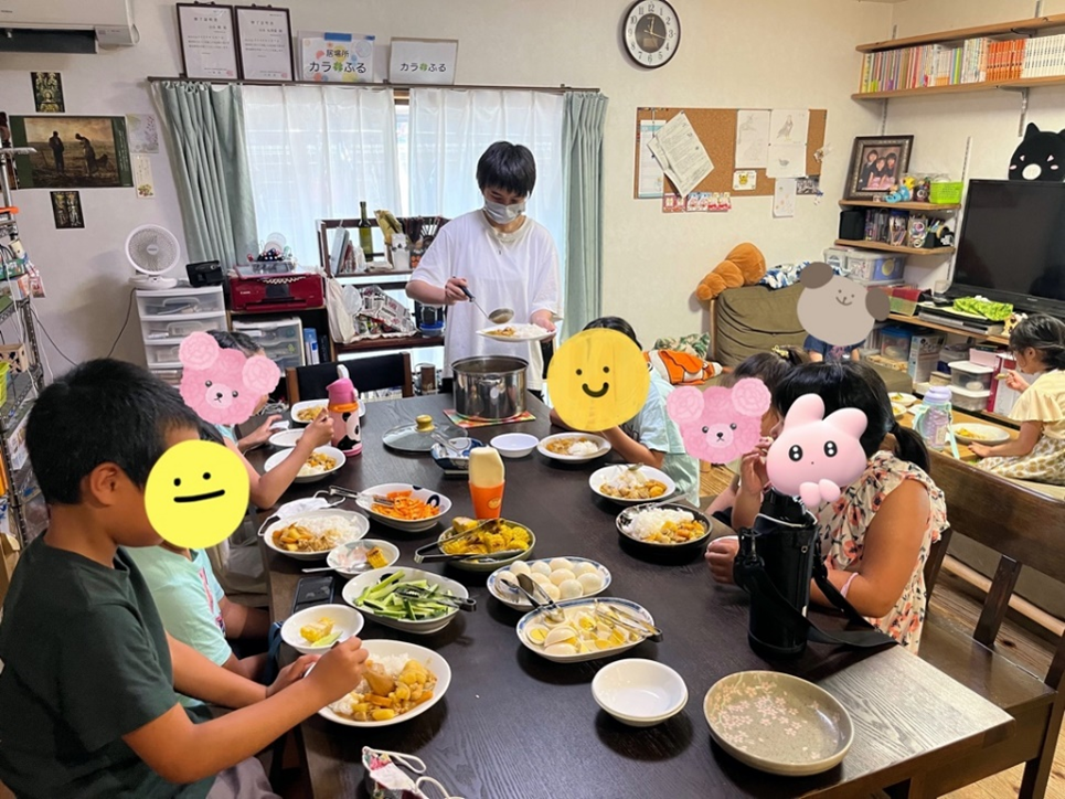 夏休みの「居場所カラ・ふる」の一場面。みんなで作ったカレーを一緒に食べます。
