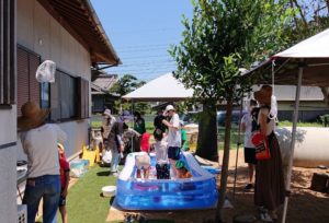 夏休みで高校生のボランティアさんも参加してにぎやかにプール遊びを庭でしました。蝉もいるので虫取りも大人気です。
