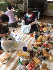 寄贈や購入の食品を家族人数に合わせて袋詰めをしています