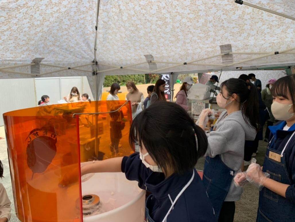 来場したこどもたちに、綿菓子をつくる高校生ボランティア。地元高校2校と協力関係にあり、虹の花は社会体験の場としても高校生を受け入れている。