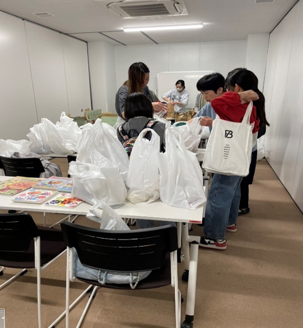 こどもの父兄がボランティアとして参加して食料の詰め合わせと相談に乗っています。