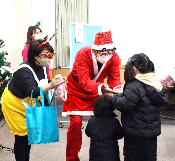 年末に開催したフードパントリーで、サンタクロースやトナカイが子どもたちにプレゼントを渡す様子
