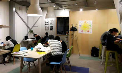カフェのような学習スペースで、eラーニングを利用し、子供たちが自ら考え、自分のペースで主体的に問題を解く力を養います。大学生チューターによる学習サポートも充実しています。