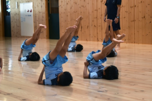 基山町内の6つの園と協働し、体と心と頭を、リズム運動や呼吸法、気持ちとことばを繋げる遊びなどを実施。