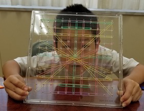 ビジョントレーニングに取り組んで、完成した作品を見せている小学生。