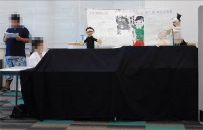 人形劇本番の写真です。タイトルは「ひきこもりたちの本音」です。ひきこもり経験者3名が作成した、完全オリジナルでの公演でした。