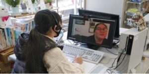 アメリカに在住している日本人とオンラインの英会話の授業を受けている風景です。とても楽しく、子供たちも授業を受けています。