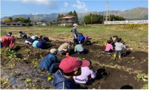 阿蘇の雄大な景色の中、「こども未来農園」で様々な農体験や生活体験を実施。昨年はカライモを植付、収穫し、焼き芋づくりを体験