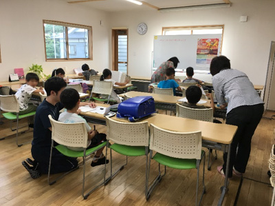 小学生の部の学習風景です。子供たちのわからないところをピンポイントで教えてくれるので、学校の授業が楽しくなっているようです。