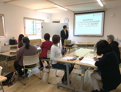 多様な問題を抱える子供たちにも幅広く対応できるように、活動に携わる先生方と「学習支援コーディネーター養成講座」を開催した時の様子